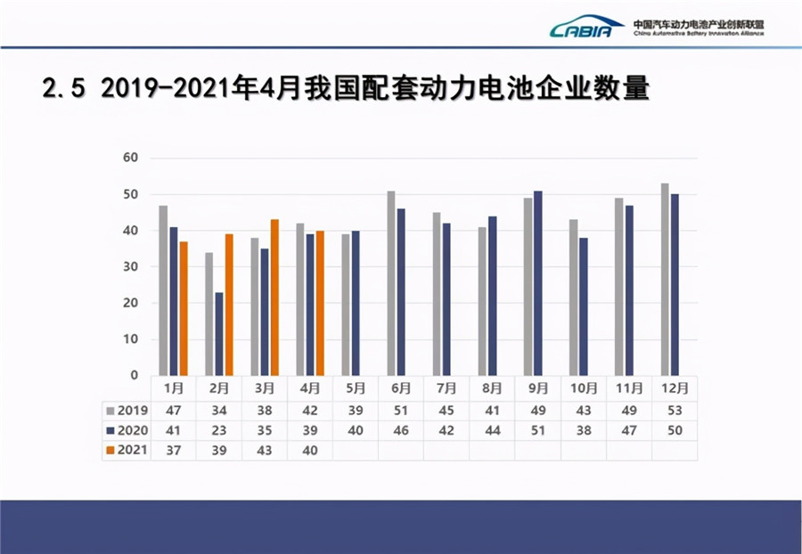 公開數據顯示,2021年4月,我國新能源汽車市場共計40家動力電池企業實現裝車配套,較去年同期增加了1家,比今年1月增加了3家。