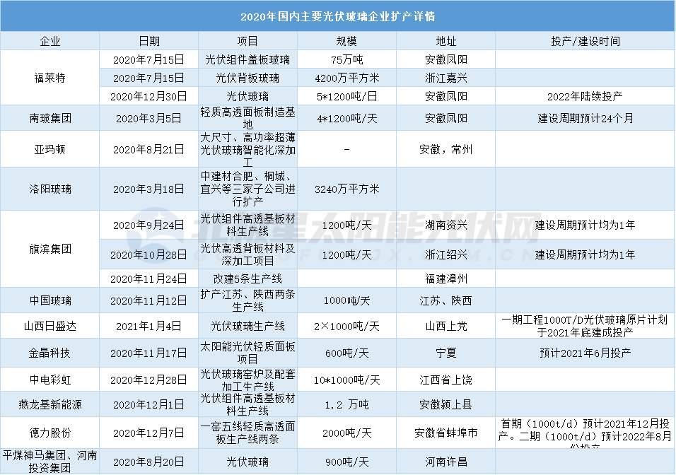 福萊特2020年宣布擴產(chǎn)75萬噸光伏組件蓋板玻璃、年產(chǎn)4200萬平方光伏背板玻璃和5座日熔化量1200噸光伏組件玻璃項目;2021年3月29日再次宣布擴建6座日熔化量1200噸光伏玻璃。