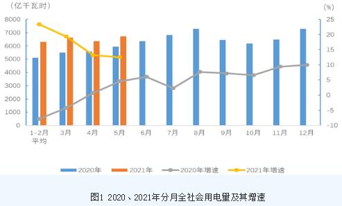 1-5月,全國工業(yè)用電量21381億千瓦時,同比增長18.5%,增速比上年同期提高22.4個百分點,占全社會用電量的比重為66.2%。5月份,全國工業(yè)用電量4624億千瓦時,同比增長11.6%,增速比上年同期提高8.8個百分點,占全社會用電量的比重為68.8%。