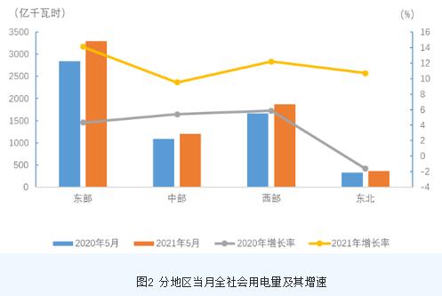 5月份,東、中、西部和東北地區(qū)全社會用電量增速分別為14.1%、9.5%、12.2%和10.7%。