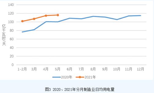 5月份,全國制造業(yè)用電量3595億千瓦時,同比增長13.7%,增速比上年同期提高11.2個百分點;制造業(yè)日均用電量116.0億千瓦時/天,比上年同期增加15.5億千瓦時/天。其中,四大高載能行業(yè)用電量合計1970億千瓦時,同比增長12.2%,增速比上年同期提高10.0個百分點;高技術及裝備制造業(yè)用電量759億千瓦時,同比增長15.9%,增速比上年同期提高10.5個百分點;消費品制造業(yè)用電量477億千瓦時,同比增長14.8%,增速比上年同期提高16.5個百分點;其他制造業(yè)行業(yè)用電量389億千瓦時,同比增長16.1%,增速比上年同期提高11.8個百分點。