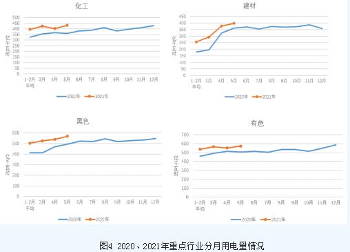 5月份,化工行業(yè)用電量431億千瓦時,同比增長14.8%,增速比上年同期提高16.9個百分點;建材行業(yè)用電量398億千瓦時,同比增長9.0%,增速比上年同期提高2.5個百分點;黑色金屬冶煉行業(yè)用電量569億千瓦時,同比增長14.6%,增速比上年同期提高12.5個百分點;有色金屬冶煉行業(yè)用電量572億千瓦時,同比增長10.4%,增速比上年同期提高7.7個百分點。