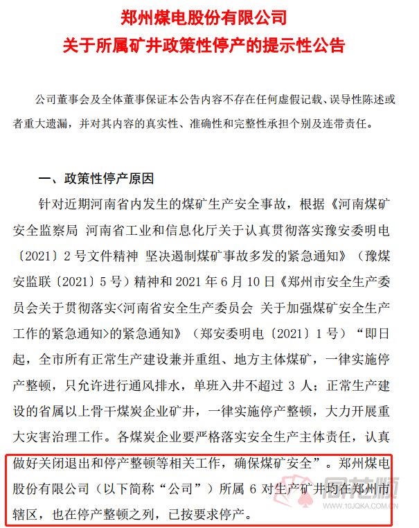 昨日晚間,鄭州煤電、大有能源均發(fā)布了《關(guān)于所屬礦井政策性停產(chǎn)的提示性公告》,并表示“鑒于目前尚無法確定恢復(fù)生產(chǎn)的具體時間,此次停產(chǎn)對公司生產(chǎn)及業(yè)績的影響暫無法準(zhǔn)確測算”。