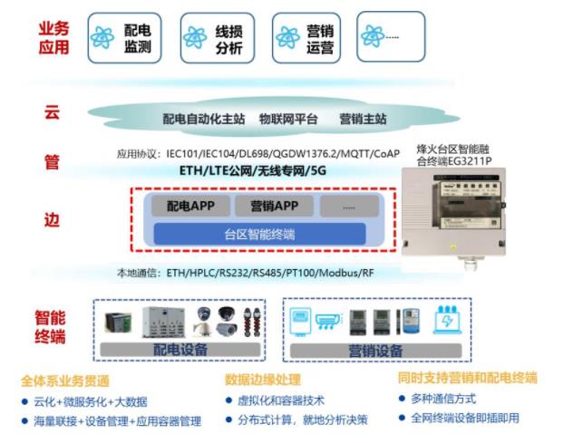 當前,為解決低壓配電網中長期存在配電臺區狀態感知難、線路運維效率低、用戶需求側管理混亂的痛點,烽火積極跟進國網需求,按照智慧電力物聯網“云-管-邊-端”的整體架構,推出臺區智能終端產品,即定位為配電自動化邊緣側設備。遠程上主要通過以太網或廣域無線網絡連接到物聯管理平臺、營銷主站、配電自動化主站或其他業務系統;本地則通過無線通信網絡、有線網絡支持各協議類型、各業務終端和傳感器的即插、即連、即用,實現感知層的通信匯聚、邊緣計算和區域自治。