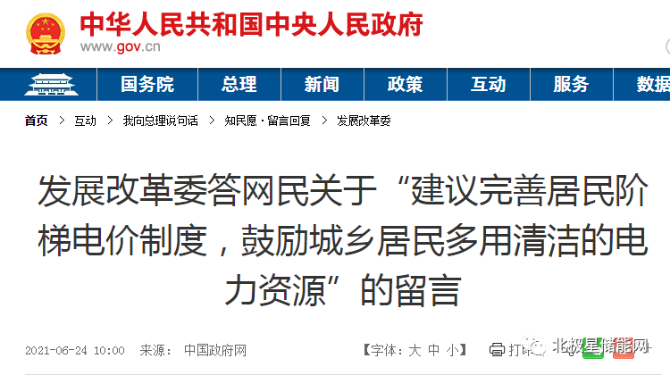 發展改革委答網民關于“建議完善居民階梯電價制度,鼓勵城鄉居民多用清潔的電力資源”的留言