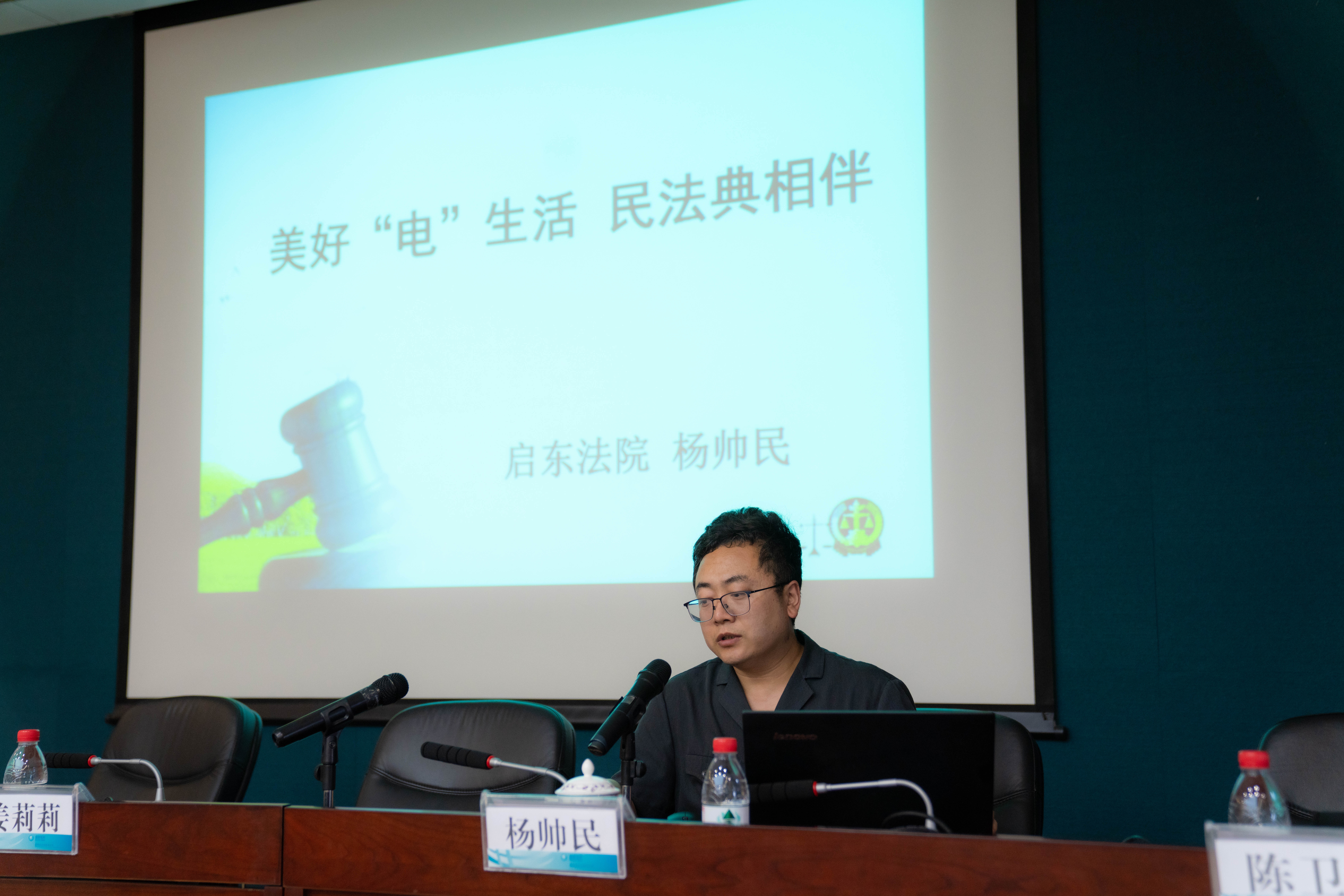 贈(zèng)書(shū)后,啟東市人民法院民一庭副庭長(zhǎng)楊帥民作了以《美好“電”生活 民法典相伴》為題知識(shí)講座。楊法官解析了近期社會(huì)熱點(diǎn)的一些案例,又重點(diǎn)講述國(guó)企員工涉及經(jīng)濟(jì)糾紛、勞動(dòng)關(guān)系、工傷、婚姻家庭、涉電經(jīng)營(yíng)等法律風(fēng)險(xiǎn),為我們作了一場(chǎng)生動(dòng)的普法教育課。