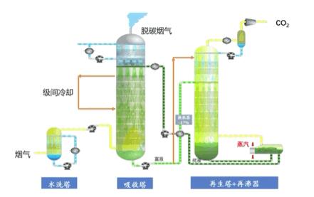 該項目以降低投資和運行成本為關鍵難點開展技術研究攻關,研發了以新型復合胺為主的吸收劑,兼容相變吸收劑、離子液體的化學吸收法CO2捕集核心技術,創新集成了"級間冷卻+分流解吸+MVR閃蒸"的新一代節能工藝,研制了低成本、高親水性塑料填料吸收塔與高效率超重力反應器,實現了煙氣CO2高效率、低能耗捕集吸收。