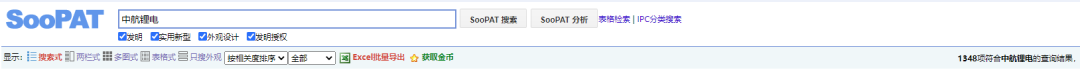 在SooPAT 專利搜索上,中航鋰電有發(fā)明專利505項,實用新型專利620項,外觀設(shè)計14項,發(fā)明授權(quán)專利209項,合計1348項。