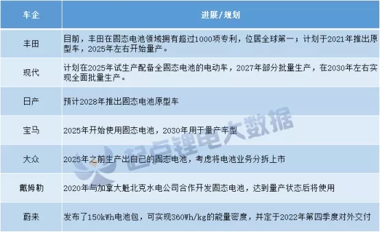 而對于車企而言,電池是電動車的核心,如今市場格局下,車企已經被動力電池企業“卡脖子”已久。主要車企相繼宣布建廠造電池,固態電池正是奪回主動權的大好機會。目前國外如豐田、現代、日產、寶馬、大眾、戴姆勒,國內如蔚來等車企均有布局。