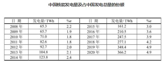 核能發電是解決2050年全球達到二氧化碳排放為零的重要支柱。20世紀60年代中國核能發電量為零,到1993年中國核能發電才開始有1.6TWh,占全球總量的0.007%;根據BP2021年報告,到2020年中國核能發電量達到366.2 TWh,占全球總量的13.6%。2020年中國居世界第二位,僅次于美國30.8%。但是中國運行、在建和擬建反應堆數將超過美國。