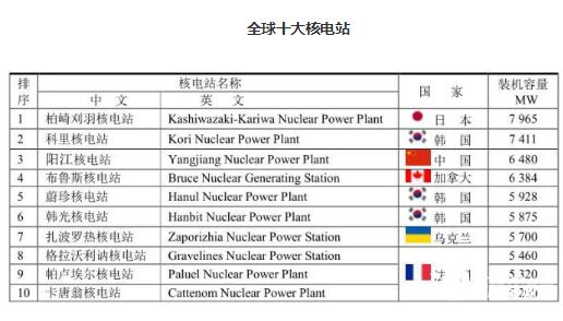 世界上最大的核電站是日本柏崎刈羽核電站,裝機容量為7965MW,但2011年已經停工。值得注意的是韓國核電站進展很快,前十位核電站就占有3席,把美國和日本都甩到后面。
