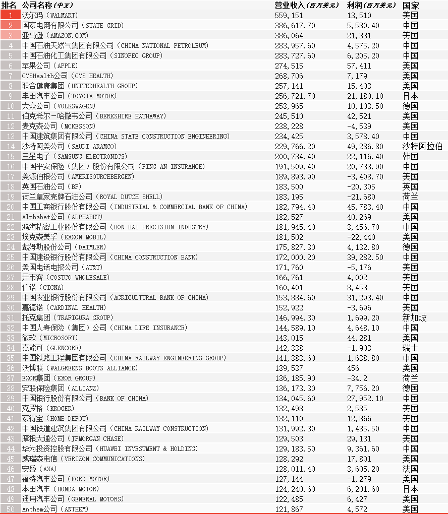 8月2日,《財(cái)富》世界500強(qiáng)排行榜發(fā)布。受新冠疫情影響,今年《財(cái)富》世界500強(qiáng)排行榜企業(yè)的營(yíng)業(yè)收入約為31.7萬億美元,比去年下降5%。今年,沃爾瑪連續(xù)第八年成為全球最大公司,中國(guó)的國(guó)家電網(wǎng)公司上升至第二位,亞馬遜首次進(jìn)入前三,蘋果公司前進(jìn)至第6位。
