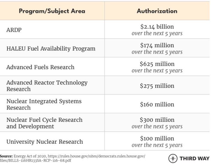 美國國會還在年底的綜合法案中,塞進了已通過的《2020年能源法案》(Energy Act of 2020),其中包括66億美元巨款的授權資金,用于先進核能。 這個法案不僅批準未來五年ARDP的資金,還有個支持國內高含量低濃縮鈾(HALEU)商用的規劃。HALEU用于最先進反應堆的燃料組分,是大規模部署的必要條件。 此外,《2020年能源法案》授權的規劃,側重于核集成的能源系統,這對于演示非電力應用的核技術如制氫、工藝供熱或除鹽非常重要。 雖然國會仍需要為這些規劃撥款,但這項授權為DOE提供了有用的指導,強烈表明先進堆是國會兩黨優先考慮的問題。