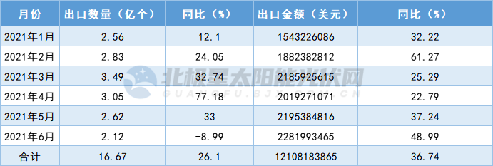 1-6月份,我國太陽能電池出口總量16.67億個,較去年同期增加26.10%;1-6月份,太陽能電池片出口金額121.08億美元,較去年同期增加36.74%。