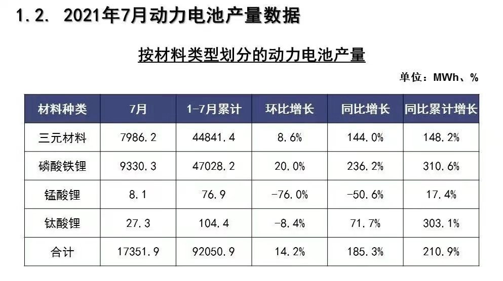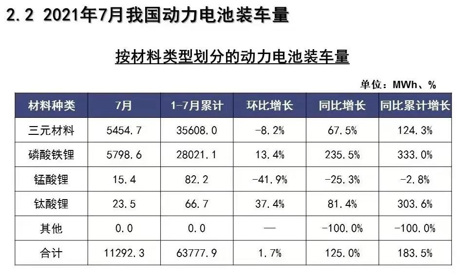 今年前7個月,動力電池領域的磷酸鐵鋰電池總產量也已超過三元電池。2018年-2020年,國內磷酸鐵鋰電池的年產量均低于三元電池。