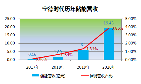 受政策環境影響、新能源汽車市場提振動力電池需求,自上市以來寧德時代便穩穩坐上國內電池裝機排名C位、且市占率超過50%,總營收連年增長。在動力電池領域之外,寧德時代另一大核心業務——儲能系統營收也實現連年翻倍式增長、2020年實現儲能總營收19.43億元,儲能在總營收所占比重也快速提升達到3.86%。