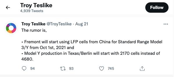 美國當(dāng)?shù)貢r間8月21日,Twitter用戶Troy Teslike(該用戶一直跟蹤特斯拉信息)表示,從10月1日開始,特斯拉Fremont工廠生產(chǎn)的標(biāo)準(zhǔn)續(xù)航版本的Model 3和Model Y將會使用來自中國的磷酸鐵鋰電池。此外,該用戶還表示,特斯拉位于Texas和Berlin的工廠,率先生產(chǎn)的Model Y將會采用2170電池,而不是4680電池。