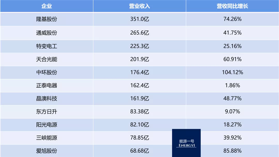 今年上半年中國(guó)光伏上市公司A股的財(cái)報(bào)已經(jīng)出爐,總計(jì)2900多億營(yíng)收、300余億凈利。其中,營(yíng)收最高的前十大公司分別是隆基股份、通威股份、特變電工、天合光能、中環(huán)股份、正泰電器、晶澳科技、東方日升和陽(yáng)光電源、三峽能源。營(yíng)收同比增幅較高的有中環(huán)股份、愛(ài)旭股份、隆基股份、天合光能、福萊特、上機(jī)數(shù)控、錦浪科技、海優(yōu)新材、固德威、奧特維、明冠新材等。