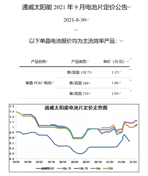 8月30日晚間,通威官網公告更新了9月太陽能電池片指導價,與8月13日公布的數據相比,單晶166電池和210電池片價格分別上調了0.02元/W和0.03元/W。