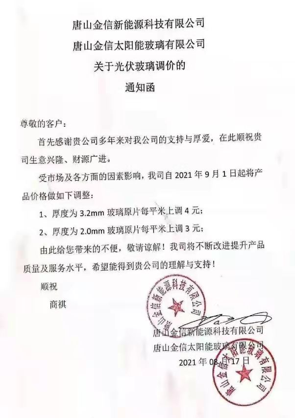 受市場影響,光伏玻璃也開始調價。唐山金信太陽能玻璃有限公司發布關于光伏玻璃調價的通知:受市場及各方面的因素影響,我司自2021年9月1日起價格調整:厚度3.2mm玻璃原片每平米上調4元,厚度2.0mm玻璃原片每平米上調3元。此外,福建臺玻及拓日新能源公告,將3.2mm鍍膜產品價格上調0.5-1元/平米至23元/平方米。