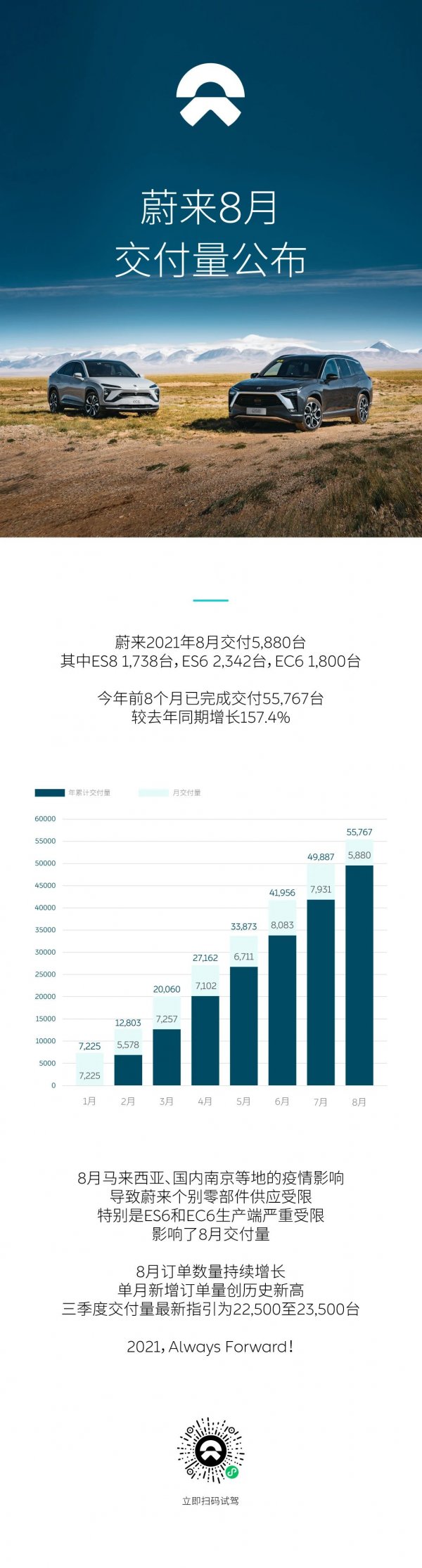 日前,蔚來公布2021年8月交付信息。蔚來8月共交付5880臺,同比增長48.3%。2021年蔚來已完成交付55767臺,較去年同期增長157.4%。此外,蔚來8月訂單數量持續增長,單月新增訂單量創歷史新高,三季度交付量最新指引為22500至23500臺(此前為23000-25000輛)。