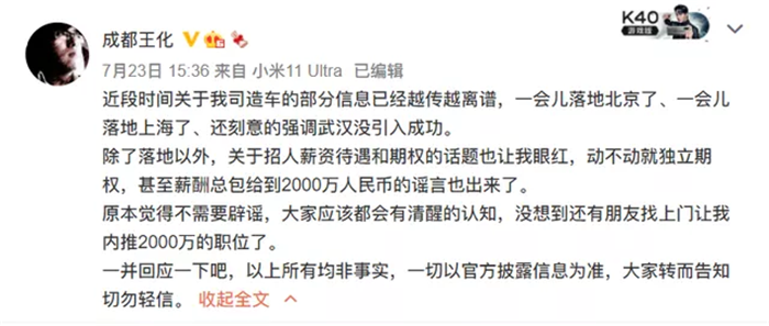 不過這一說法很快就被小米公關部總經理王化予以否認:「以上所有均非事實,一切以官方披露信息為準,大家轉而告知切勿輕信。」
