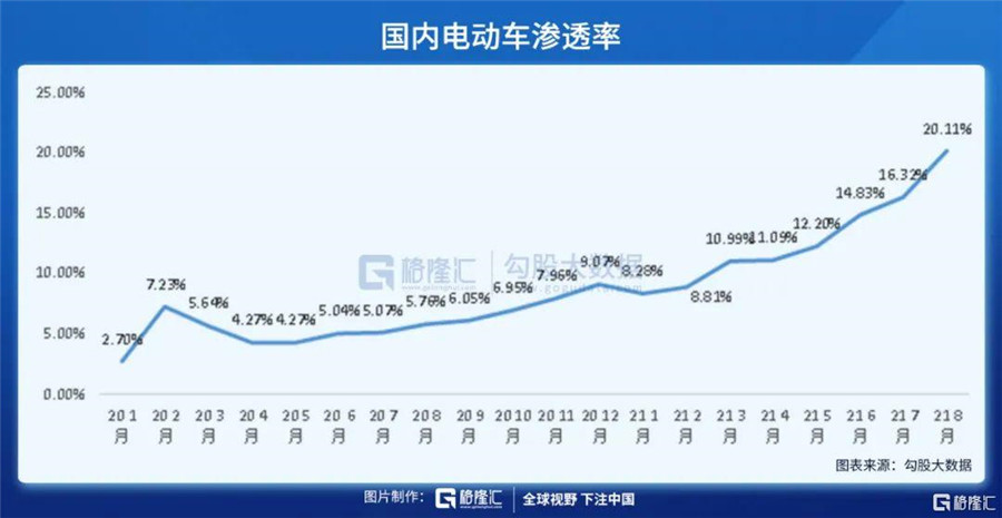 說完銷量,來看看最關(guān)心的滲透率。新能源汽車1-8月滲透率12.8%。8月滲透率(批發(fā)量數(shù)據(jù))達(dá)到20.1%,7月滲透率為16.32%,滲透率環(huán)比大幅上升,同時這也是第一次新能源汽車國內(nèi)滲透率破20%。滲透率在經(jīng)過了一年的緩慢爬坡之后,開始進(jìn)入加速階段。市場上更有券商大膽預(yù)測,實現(xiàn)25%的滲透率或許不是在2025年,很有可能會在2022年提前到來。