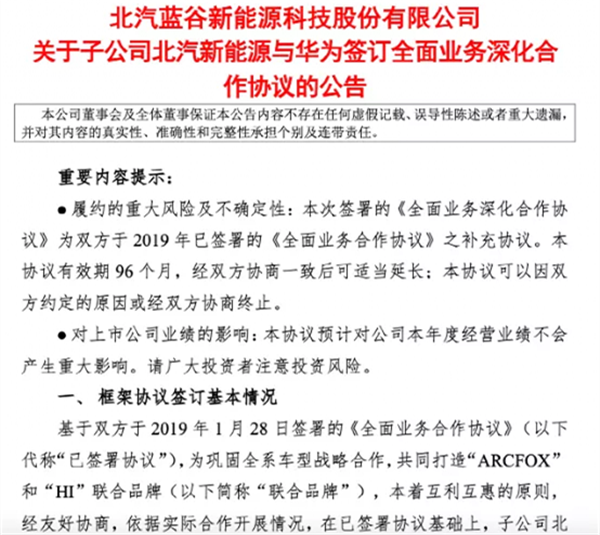 9月26日晚,北汽藍谷發(fā)布公告稱,公司和華為簽署合作協(xié)議,有效期96個月,共同打造“ARCFOX” 和“HI”聯(lián)合品牌。