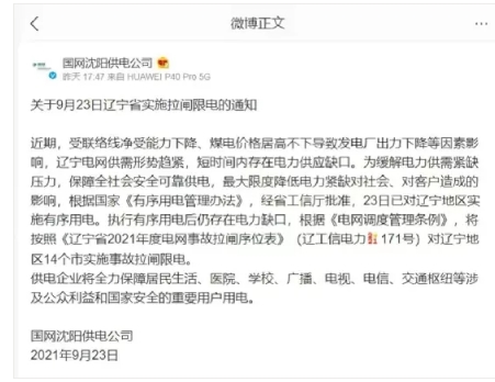 9月24日,國網沈陽供電公司發(fā)布通知稱,近期,受聯(lián)絡線凈受能力下降、煤電價格居高不下導致發(fā)電廠出力下降等因素影響,遼寧電網供需形勢趨緊,短時間內存在電力供應缺口。為緩解電力供需緊缺壓力,保障全社會安全可靠供電,最大限度降低電力緊缺對社會、對客戶造成的影響,根據(jù)國家《有序用電管理辦法》,經省工信廳批準,23日已對遼寧地區(qū)實施有序用電。