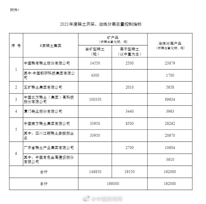 2021年度稀土開采、冶煉分離總量控制指標分別為168000噸、162000噸,上述指標均含已下達的第一批指標。