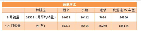 就連與近來勢頭很猛的比亞迪相比,特斯拉也毫不遜色。雖然第三季度月均銷量不如比亞迪9月份的表現(xiàn),但其1-9月的累計銷量要更勝一籌。比亞迪官方數(shù)據(jù)顯示,今年9月,比亞迪旗下EV車型銷量為36306輛,1-9月,EV車型累計銷量為185124輛。