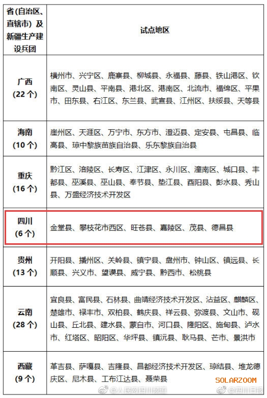 國家能源局近日發布《關于公布整縣(市、區)屋頂分布式光伏開發試點名單的通知》,四川6地入選全國試點開發名單:金堂縣、攀枝花市西區、旺蒼縣、嘉陵區、茂縣、德昌縣?!锻ㄖ访鞔_,2023年底前,試點地區各類屋頂安裝光伏發電的比例均達到《通知》要求的,列為整縣(市、區)屋頂分布式光伏開發示范縣。
