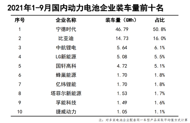 中國汽車動力電池產(chǎn)業(yè)創(chuàng)新聯(lián)盟數(shù)據(jù)顯示,今年1-9月,國內(nèi)動力電池企業(yè)裝車量前5名分別為:寧德時代(占比50.8%)、比亞迪(占比16.0%)、中航鋰電(占比6.1%)、LG新能源(占比5.5%)、國軒高科(占比5.1%)。