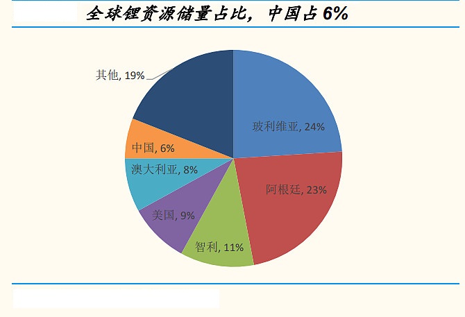根據(jù)美國地質(zhì)調(diào)查局USGS數(shù)據(jù),截至2020年末,全球鋰資源量約8600萬噸,其中南美“鋰三角”地區(qū)(智利、阿根廷和玻利維亞交界處的高海拔湖泊和鹽沼)的鋰資源量之和約占全球鋰資源總量的近60%。中國目前探明的鋰資源基本為鹵水鋰,儲量占比只有6%。80%的鋰原料依賴進口。
