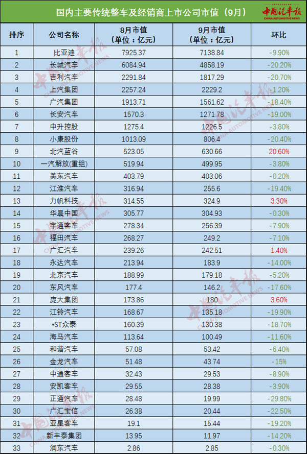 9月國內主要傳統整車及經銷商上市公司市值表現的亮點之一,是出現2家環比上升的車企。北汽藍谷市值達630.66億元,環比上升20.6%,上漲幅度位居該類別排名中第一,在股市同行的一片下滑中很是醒目。9月26日,北汽藍谷發布公告稱,子公司北汽新能源與華為簽署全面業務深化合作協議,共同打造“ARCFOX”和“HI”聯合品牌。雙方就營銷渠道共享制定細化方案并實施,計劃于今年底前實現極狐阿爾法S(HI版)的線上線下渠道銷售合作。由此引發業內推測,極狐有可能成為繼賽力斯之后,第二家進駐華為線下門店的汽車品牌。于是,9月27日開盤,北汽藍谷在連續兩周跌幅達15.66%后一字漲停,此后也延續升勢。而另一家市值環比上升的企業是力帆科技,其9月市值達324.9億元,繼上月環比上漲49.7%后,再次環比上升3.3%。9月22日,首批100輛力帆楓葉80V換電出租車正式交付運營。從當日起,其連續四天股價呈現較大幅度上漲。經歷重整,成功引入戰略投資者和產業投資人后,力帆科技正逐步煥發新生。