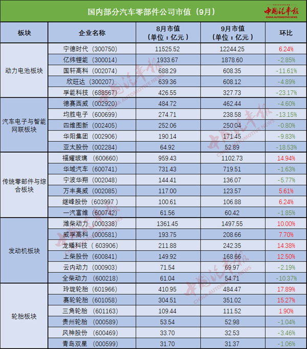 相比于8月,9月國內汽車零部件企業市值出現普遍回落。其中,動力電池板塊、汽車電子與智能網聯板塊市值跌幅明顯。傳統零部件與綜合板塊、輪胎板塊經歷了此前的市值增長之后,也開始出現回落苗頭。