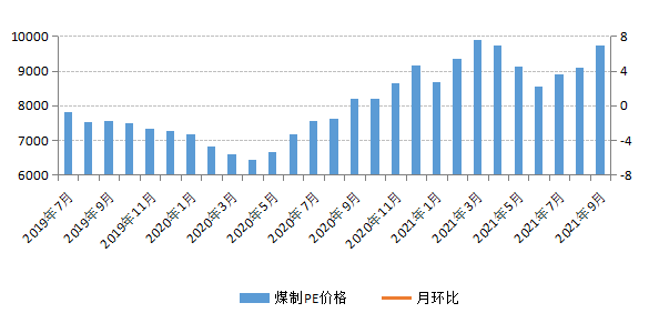 9月份,農(nóng)膜、棚膜、高端日光膜及管材等需求逐漸走強(qiáng),下游企業(yè)采購(gòu)積極,PE市場(chǎng)需求迎來(lái)傳統(tǒng)旺季;同時(shí),在能耗“雙控”及環(huán)保壓力雙重影響下,PE市場(chǎng)供應(yīng)依然偏緊,加上上游動(dòng)力煤貨緊價(jià)揚(yáng)對(duì)PE價(jià)格形成的支撐作用,進(jìn)一步推動(dòng)了煤制PE價(jià)格的上漲。9月份,煤制PE平均交易價(jià)格為9716.10元/噸,環(huán)比上漲6.91%,同比上漲18.72%。