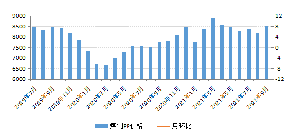 一方面,9月份為PP市場(chǎng)需求傳統(tǒng)旺季,下游訂單整體邊際好轉(zhuǎn),但是下游企業(yè)對(duì)高價(jià)PP采購(gòu)較為謹(jǐn)慎,特別是中小型企業(yè)以隨用隨采的策略為主;同時(shí),受汽車芯片短缺影響,汽車廠存在被迫減產(chǎn)現(xiàn)象,一定程度上利空塑料需求。另一方面,9月份部分PP生產(chǎn)裝置檢修,市場(chǎng)供應(yīng)有所減少。在供應(yīng)偏緊、需求弱勢(shì)復(fù)蘇以及煤炭?jī)r(jià)格形成強(qiáng)勁支撐等綜合作用下,煤制PP價(jià)格小幅上漲。9月份,煤制PP平均交易價(jià)格為8522.96元/噸,環(huán)比上漲4.40%,同比上漲9.69%。