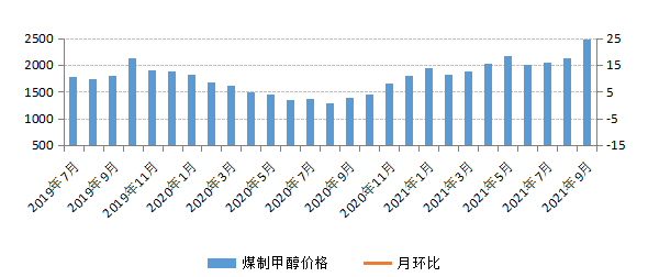 9月份,雖然煤炭增產(chǎn)保供政策相繼落地,上游原料煤炭供應(yīng)有所提升,但是甲醇產(chǎn)量增加不及預(yù)期,市場(chǎng)供應(yīng)依舊有限,企業(yè)庫(kù)存維持低位,供給偏緊格局尚未扭轉(zhuǎn)。同時(shí),甲醇市場(chǎng)需求較好,特別是臨近“國(guó)慶”,下游企業(yè)節(jié)前備貨積極,甲醇市場(chǎng)需求進(jìn)一步走強(qiáng)。在供給結(jié)構(gòu)偏緊及較強(qiáng)成本支撐下,煤制甲醇價(jià)格呈上漲態(tài)勢(shì)。9月份,煤制甲醇平均交易價(jià)格為2482.75元/噸,環(huán)比上漲16.71%,同比上漲78.92%。