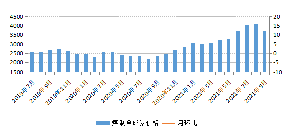 9月份,雖然受噴吹煤供應(yīng)偏緊影響部分合成氨裝置減產(chǎn),合成氨市場(chǎng)供應(yīng)有所走弱,但同時(shí)在環(huán)保檢查影響下,煤制合成氨下游企業(yè)開工率整體不高,下游需求不強(qiáng),在市場(chǎng)供需兩弱的環(huán)境下,煤制合成氨價(jià)格高位回落。9月份,煤制合成氨平均交易價(jià)格為3718.73元/噸,環(huán)比下降9.46%,同比上漲58.36%。