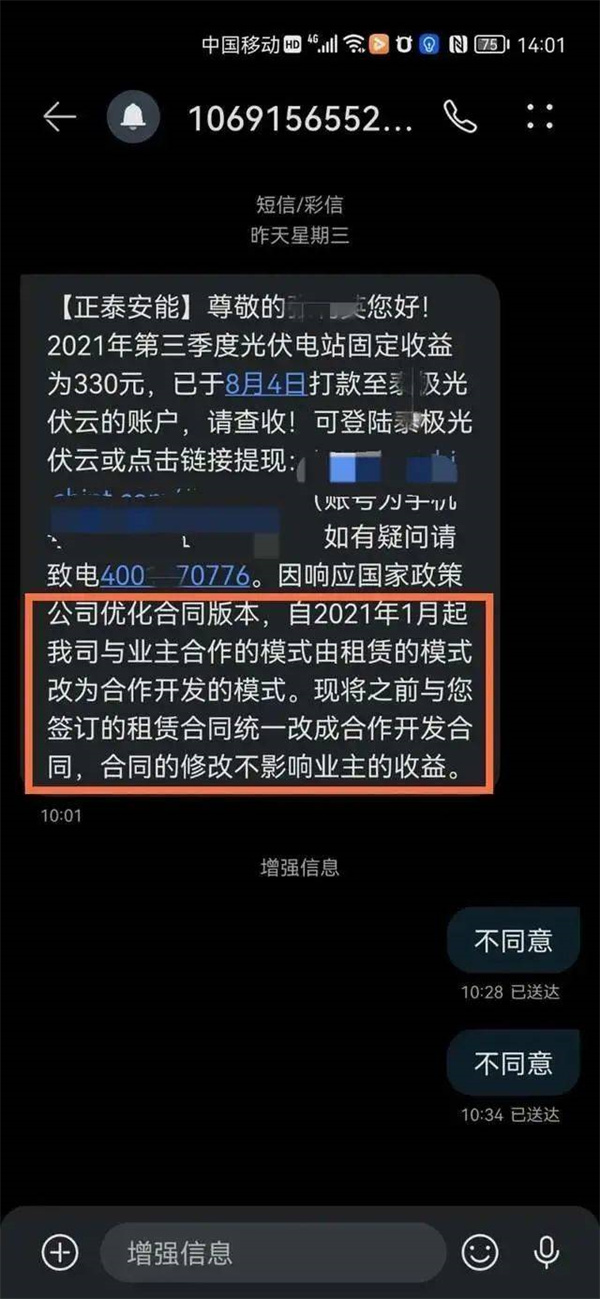 她家屋頂安裝的是大品牌商正泰光伏的玻璃板。短信內容是:“因響應國家政策,公司優化合同版本,自2021年1月起,公司與業主合作模式由租賃模式改為合作開發的模式,現將之前與您簽訂的租賃合同改成合作開發合同,合同的修改不影響業主的權益。”