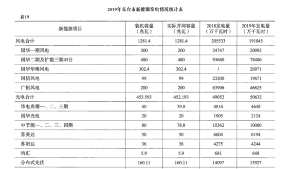 江蘇省東臺市2019年年鑒中披露的統計數據也間接驗證了李敏澤的觀點。統計數據中當年并網電站有160兆瓦(16萬千瓦),發電量是1.59億度。據此計算,10千瓦的電站,發電量大約是9948度。