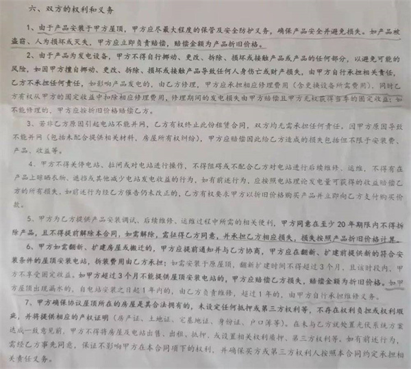 她一條條細讀,視線移到合同第六章對雙方權利和義務規定的第一條——“如果發電產品被盜竊、人為損壞或滅失,甲方(金禮云)應立即負責賠償,賠償金額為產品的折舊價格。”金禮云心里猛地“咯噔”了一下:“設備裝在自家屋頂,肯定會盡全力去維護設備的運轉,但是天災、盜竊怎么辦?我也無能為力啊,你找老天爺啊?”