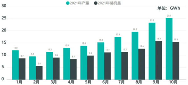圖1 2021年1-10月的月度產量和裝機量的對比