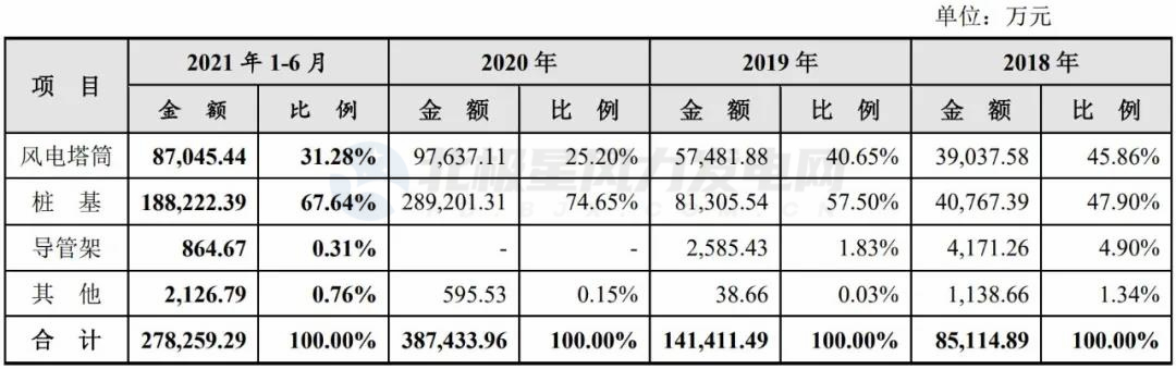 2021年半年報顯示,海力風電的主營業務為樁基、海上風電塔筒、其他業務、其他、陸上風電塔筒,占營收比例分別為:66.39%、30.06%、1.85%、0.75%、0.64%。報告期內,主要產品的銷售收入及占比情況如下: