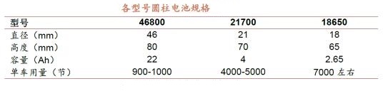 4、生產效率提升:體現在大電芯上,同樣用于75kWh的電動車,老版18650需要7100個左右電芯,21700需要4400+個電芯,而新型電池4680僅需要950個電芯,更少的單體數量意味著空間利用率的提高,同時生產組裝需要的時間減少,因此成組效率大大提升;