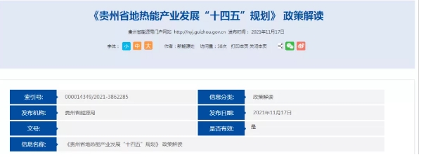 2021年11月17日,貴州省能源局官網發布了《貴州省地熱能產業發展“十四五”規劃》 政策解讀一文。全文介紹了《規劃》編制的目的意義,闡述了地熱能產業發展目標、規劃布局、重點任務等內容,以及六項保障措施。