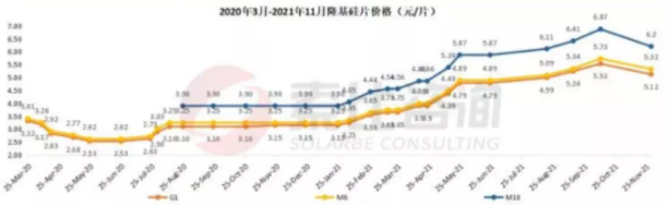 10月下旬,因光伏產業鏈價格持續上漲,終端電站建設需求低迷,硅片出現了小幅下滑的跡象。由于對年末搶裝的預期,硅片價格隨后企穩。