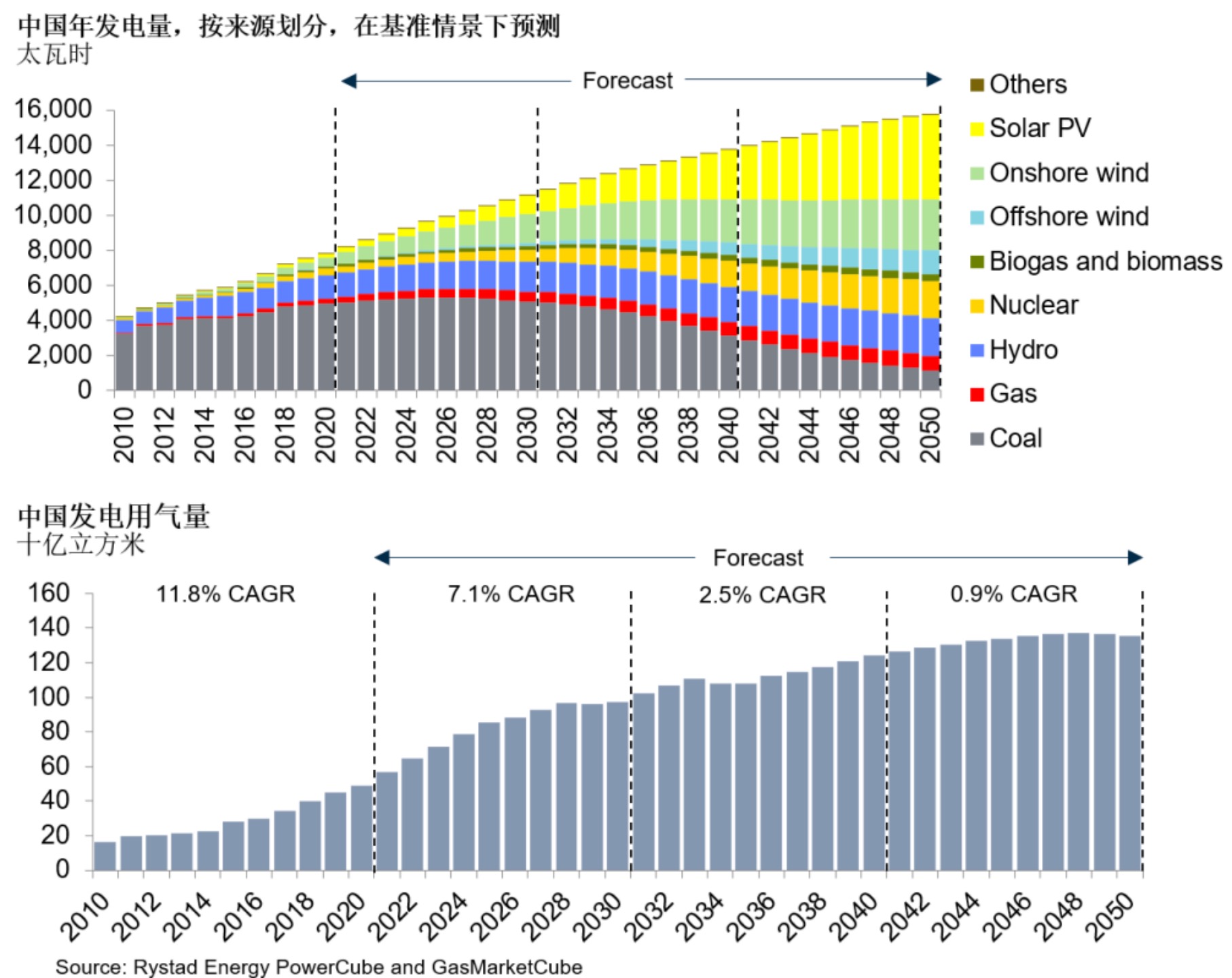 睿咨得能源(Rystad Energy)預計,在2020-2030年期間,中國發電用氣需求將以7.1%的年均復合增長率增長,期間將有更多的燃氣電廠投產用于調峰。2030-2040年發電用氣需求年均復合增長率將放緩至2.5%,但屆時將是中國天然氣需求增長的主要驅動力,為了實現2060年碳中和目標,中國正在穩步降低煤炭發電的比重,而天然氣將對確保電力穩定供應至關重要。