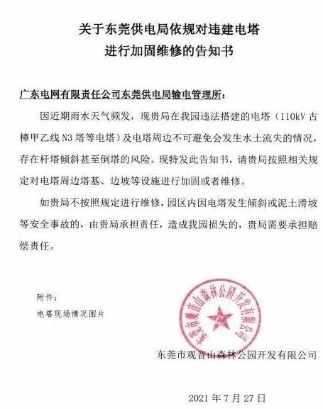 2021年7月27日,東莞觀音山方面發函敦促東莞市供電局,盡快依法依規對觀音山公園內因違法架建而導致山體塌方形成的傾斜電塔的塔基進行維護加固。